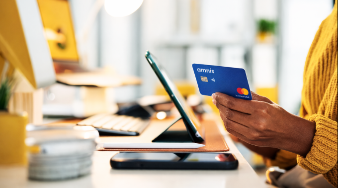 Frau sitzt am Schreibtisch und hält eine amnis Business-Debitkarte sowie ein Smartphone, während sie Online-Zahlungen oder Ausgaben verwaltet.